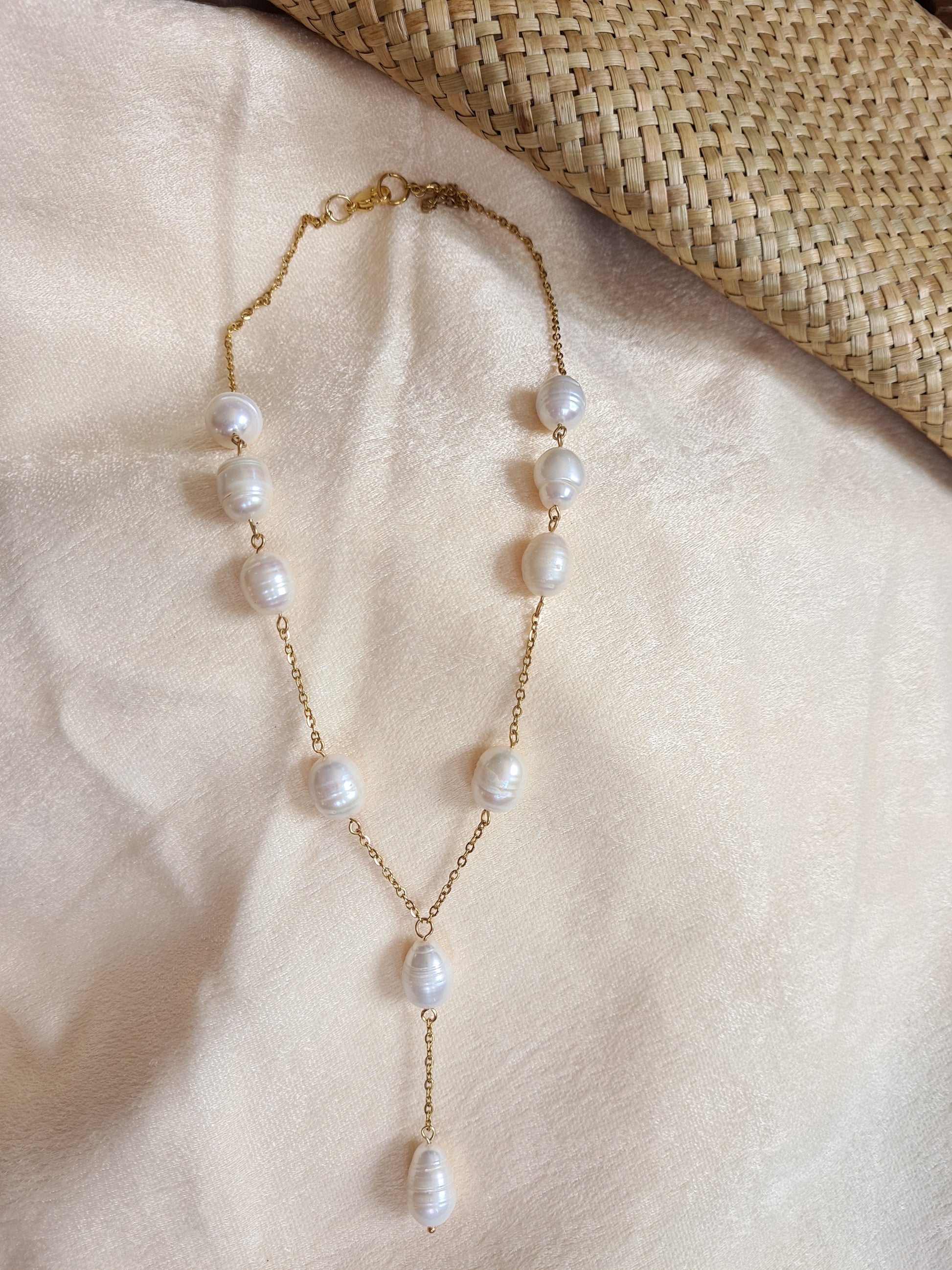 Fresh water pearl necklace on gold plated and stainless steel hardware. Discover sophistication and elegance with our signature pearl necklace. The gleaming gold and sleek stainless steel hardware sets this piece apart, creating a unique and timeless accessory.