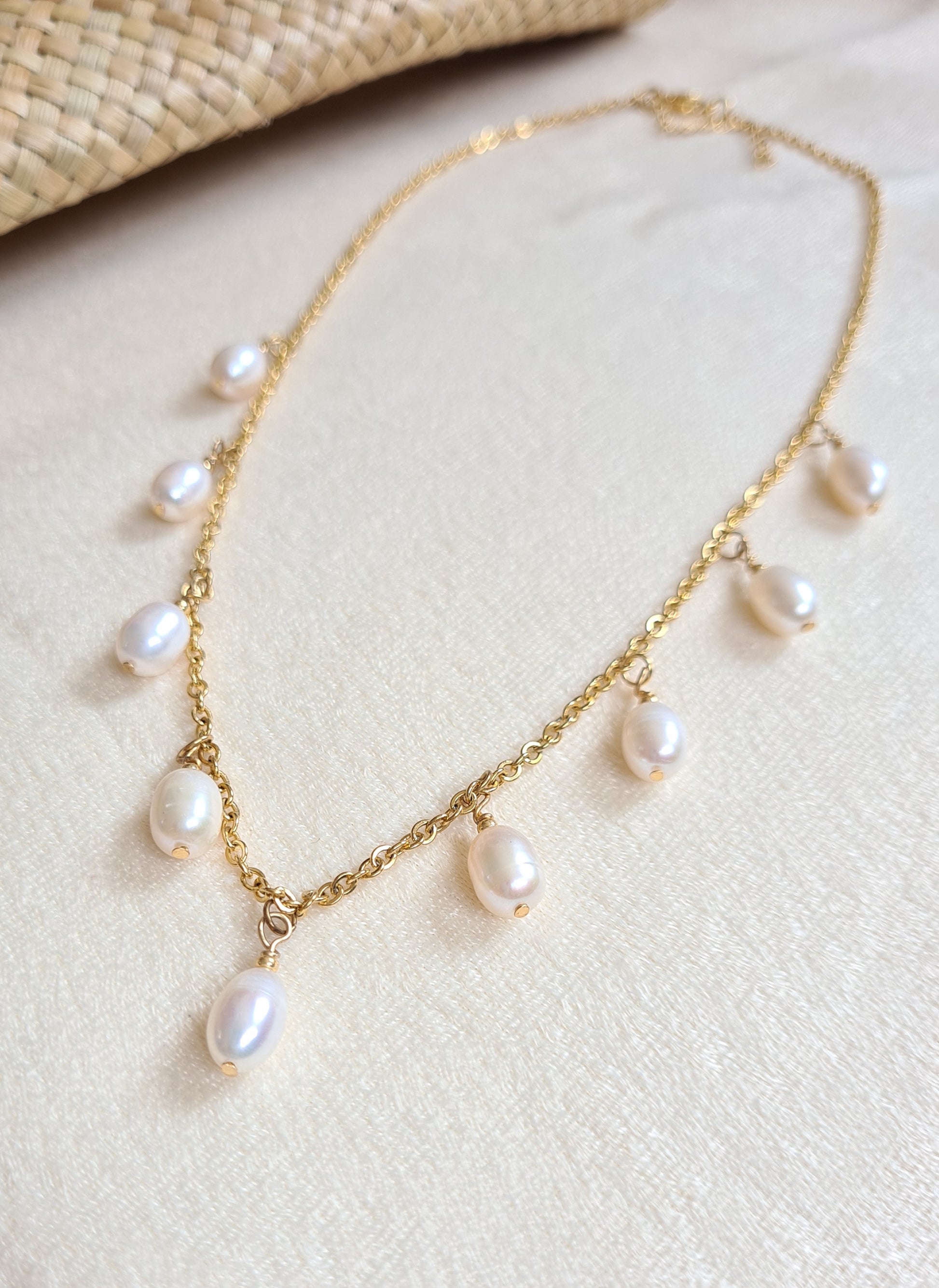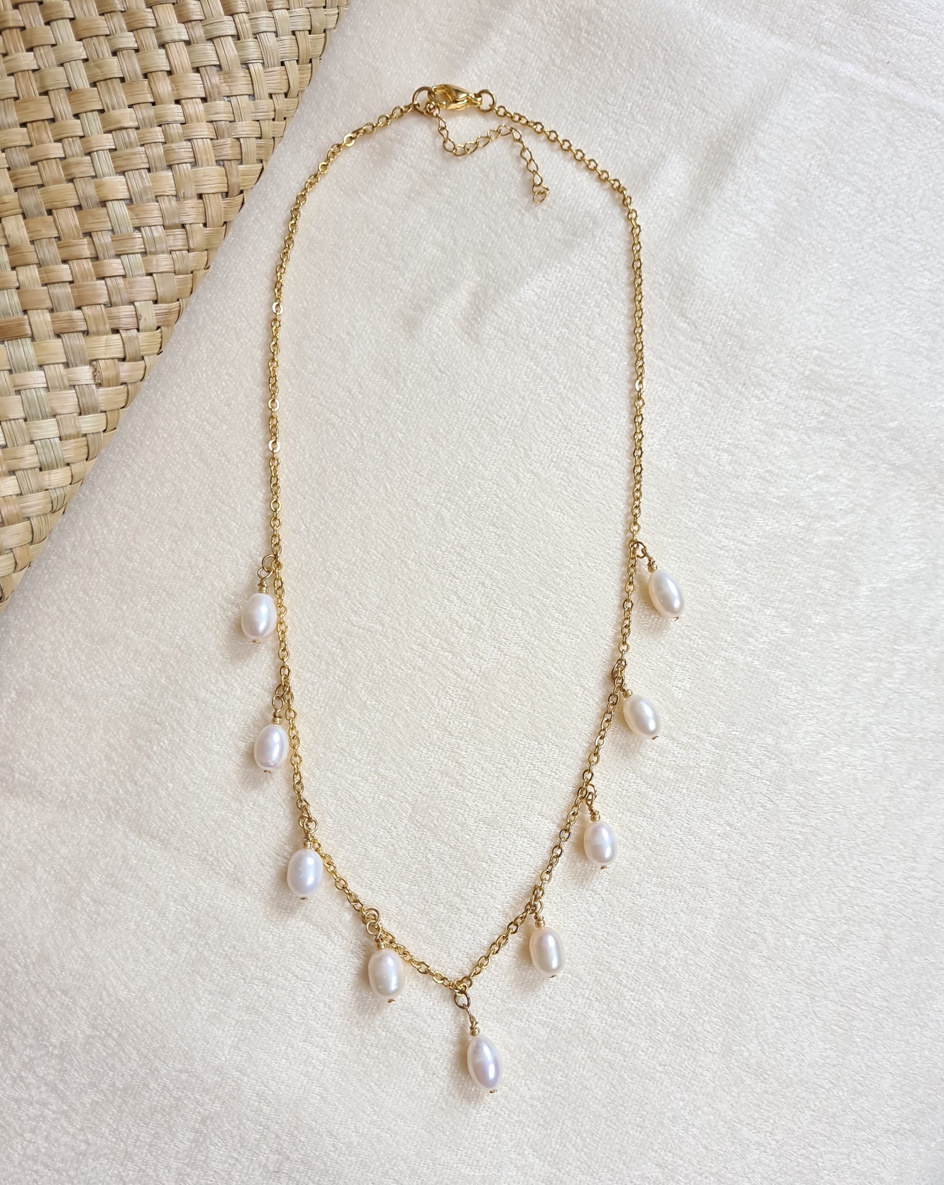 This gold plated and stainless steel hardware necklace features fresh water pearls. Measuring at 47 centimeters in length, with an additional 6 centimeters extender, it is the perfect addition to any jewelry collection.
