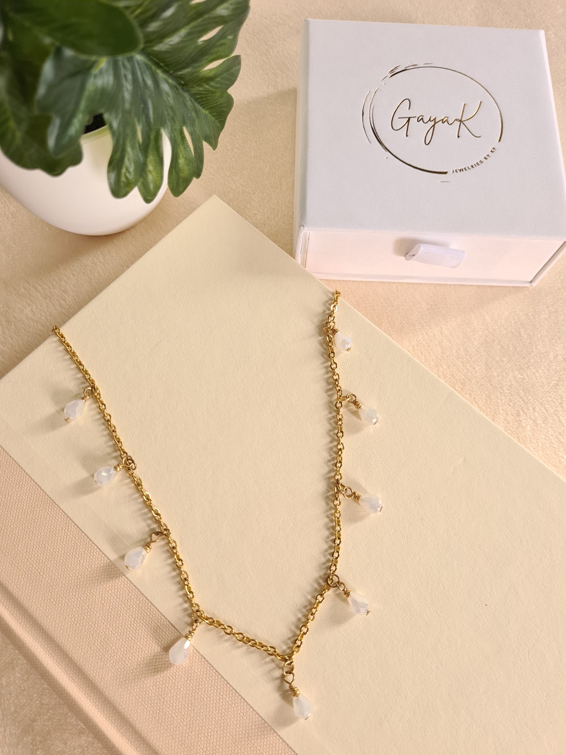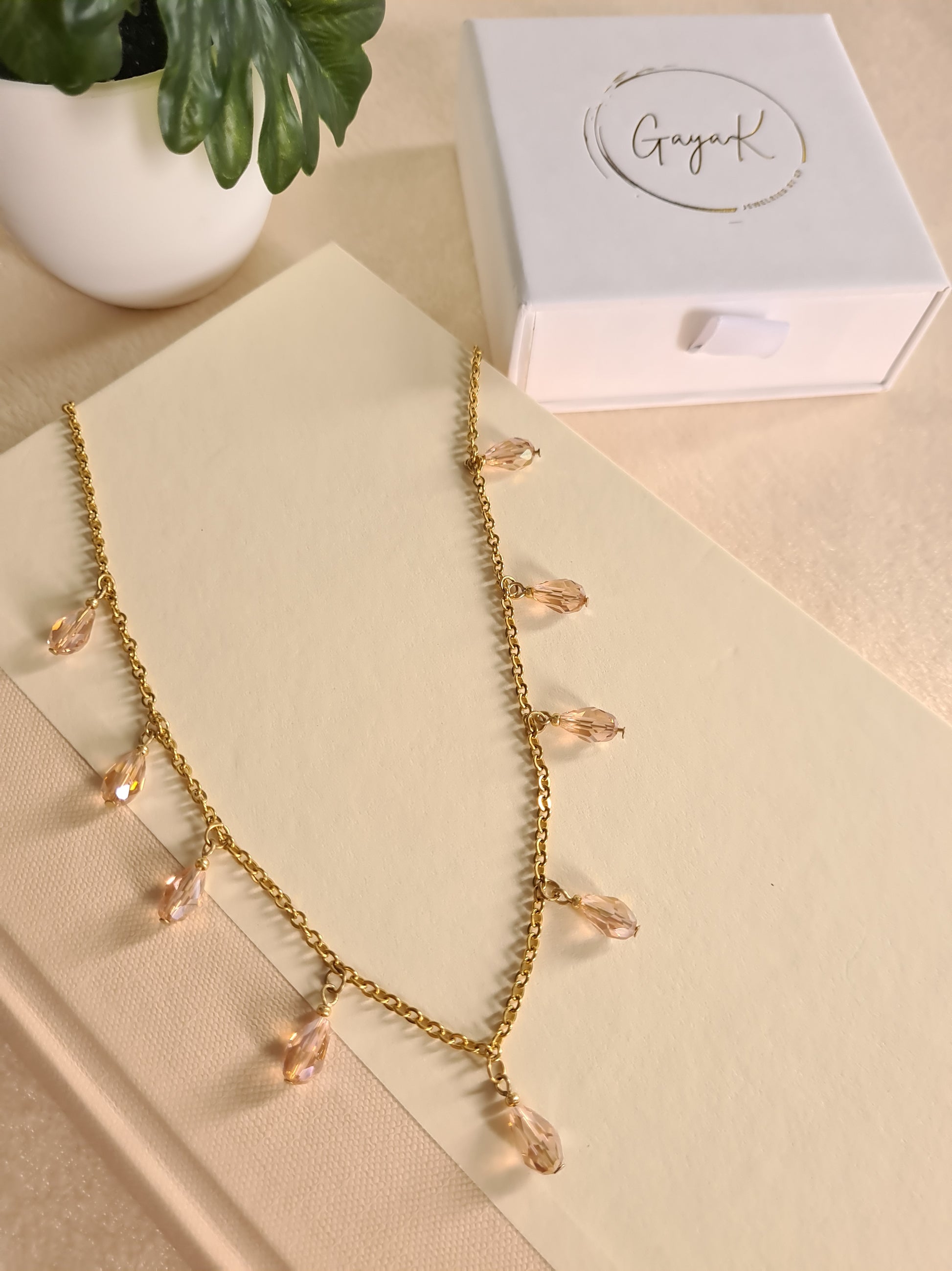 Dazzle with the bohemian style of these Czech beads, meticulously crafted and set on a combination of gold plated and stainless steel chain. Choose from pink or white options for a pop of color.