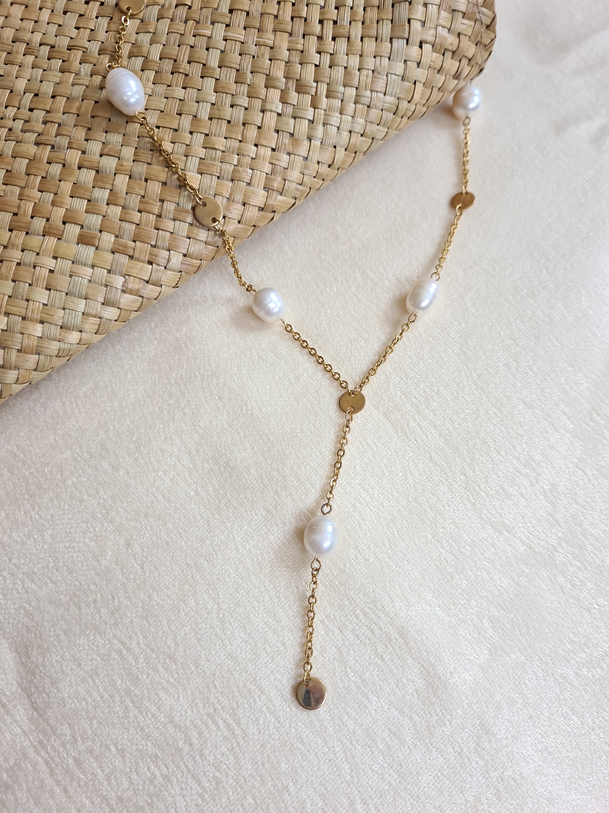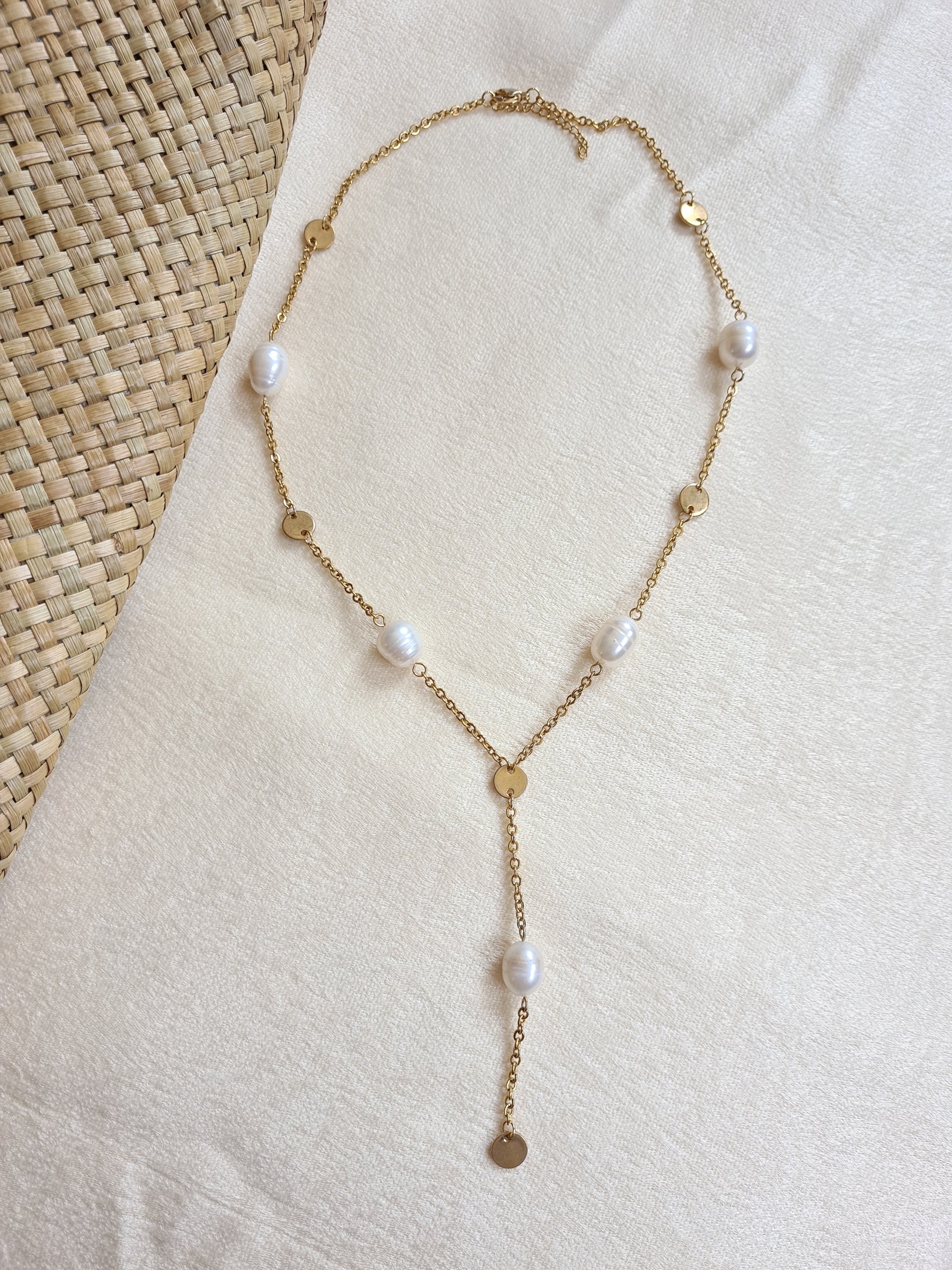 This necklace features a combination of gold plated and stainless steel hardware, complemented by a freshwater pearl. It measures 54 centimeters in length and includes a 6 centimeters extender for added versatility.