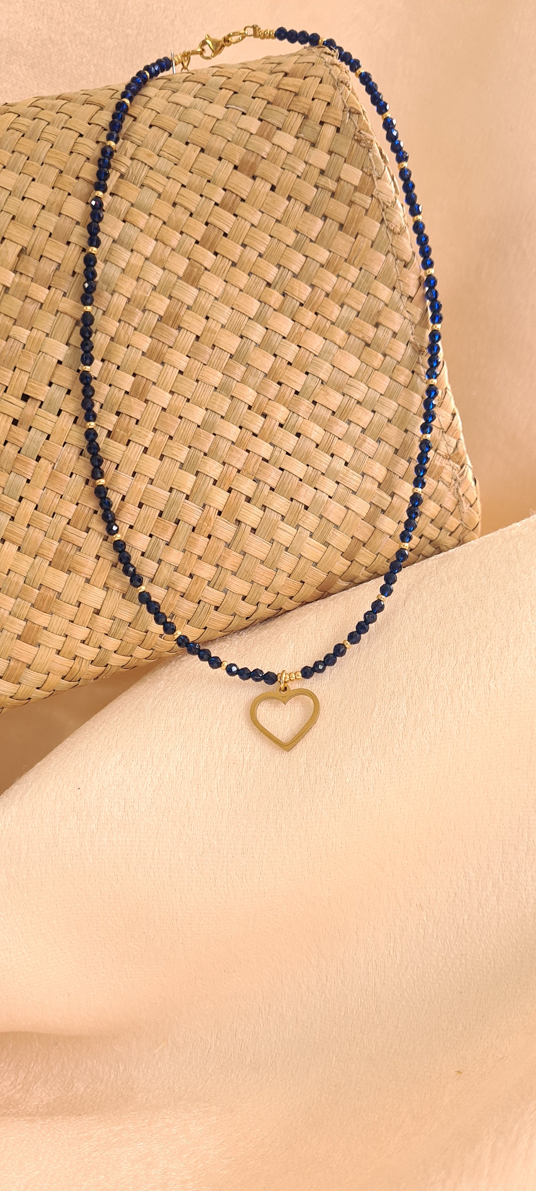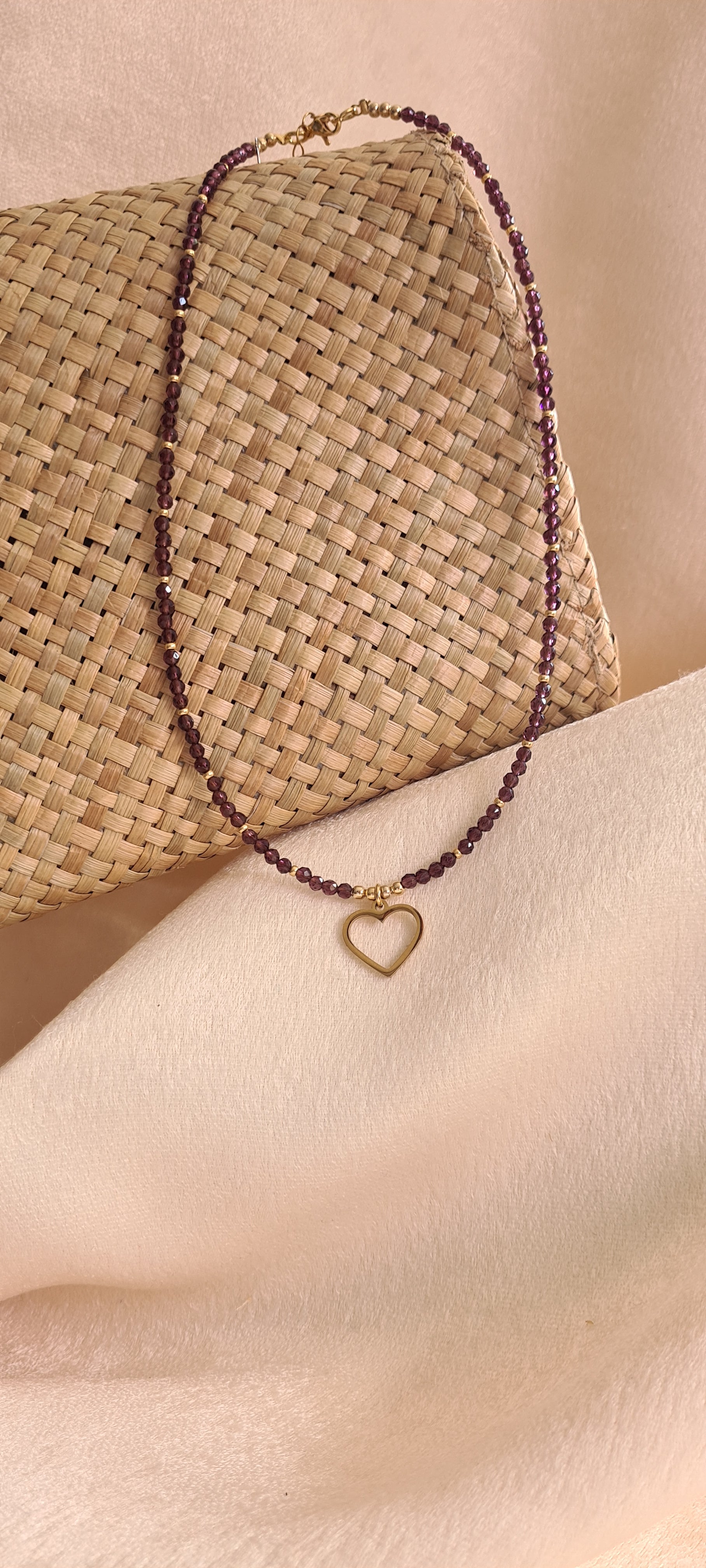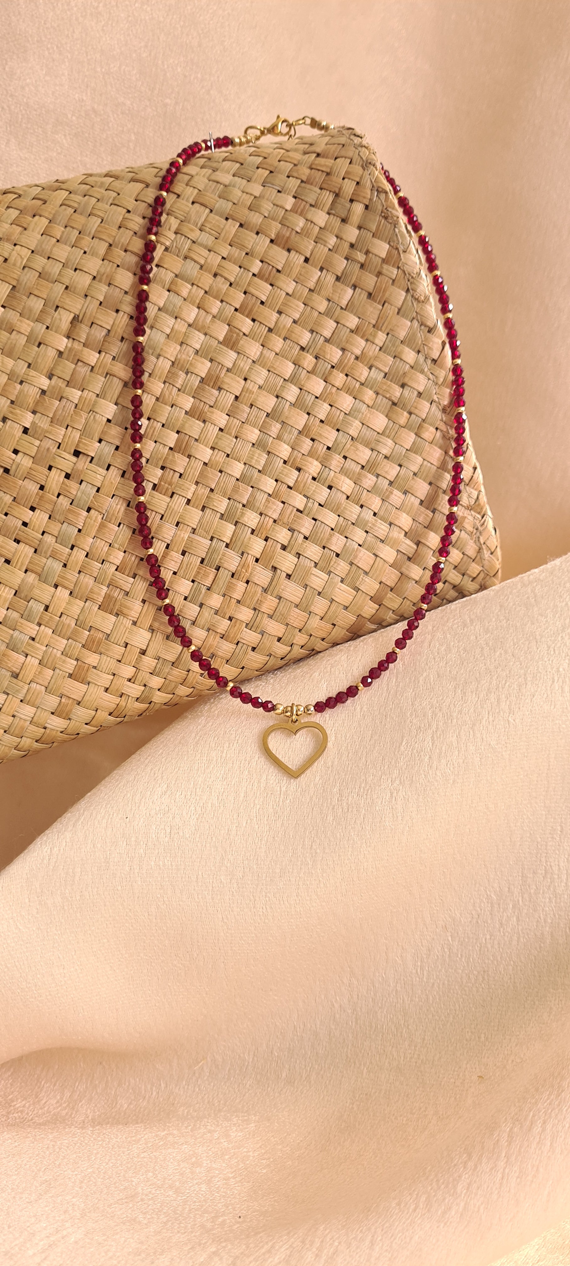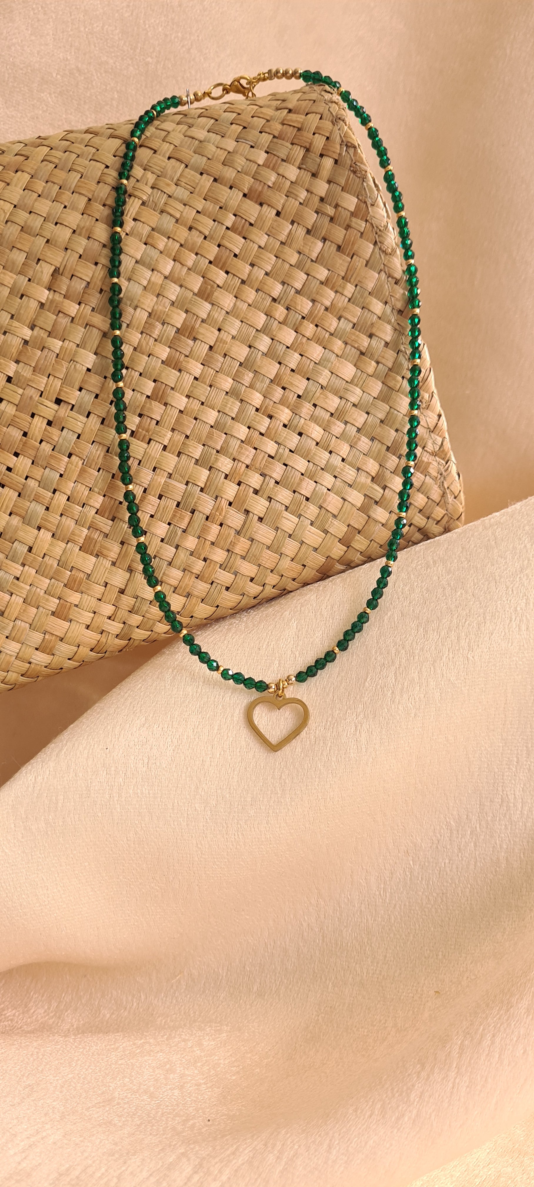 Expertly crafted with semi-precious stones, this necklace highlights a delightful heart pendant and gleaming hardware made of gold-plated stainless steel. Available in Green, red, black, and maroon color variations.