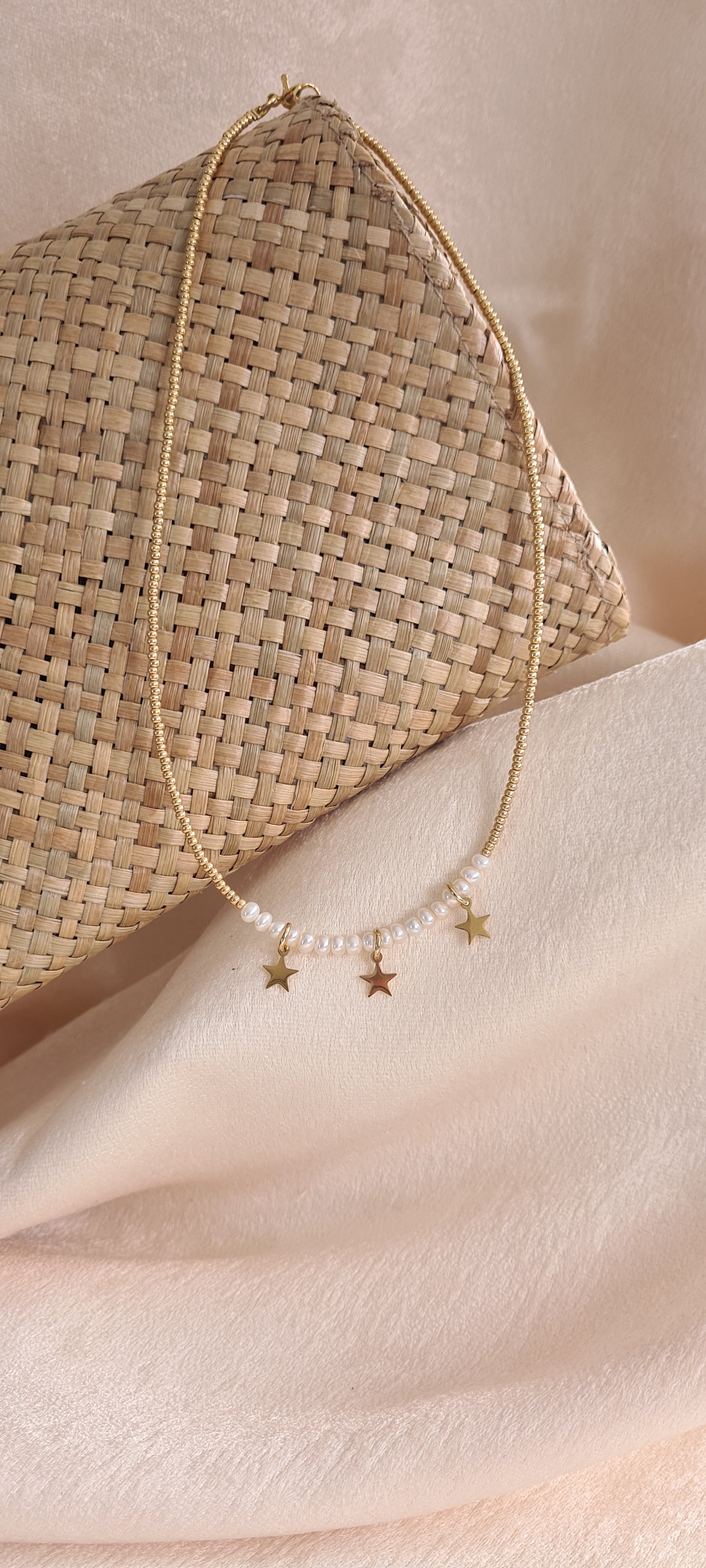 Indulge in the opulent beauty of our freshwater pearl necklace, gold beads adorned with a gold-plated and stainless steel hardware. Complete with a stunning 3-star pendant, this luxurious piece measures 39 centimeters with an additional 6-centimeter extender for the perfect fit.