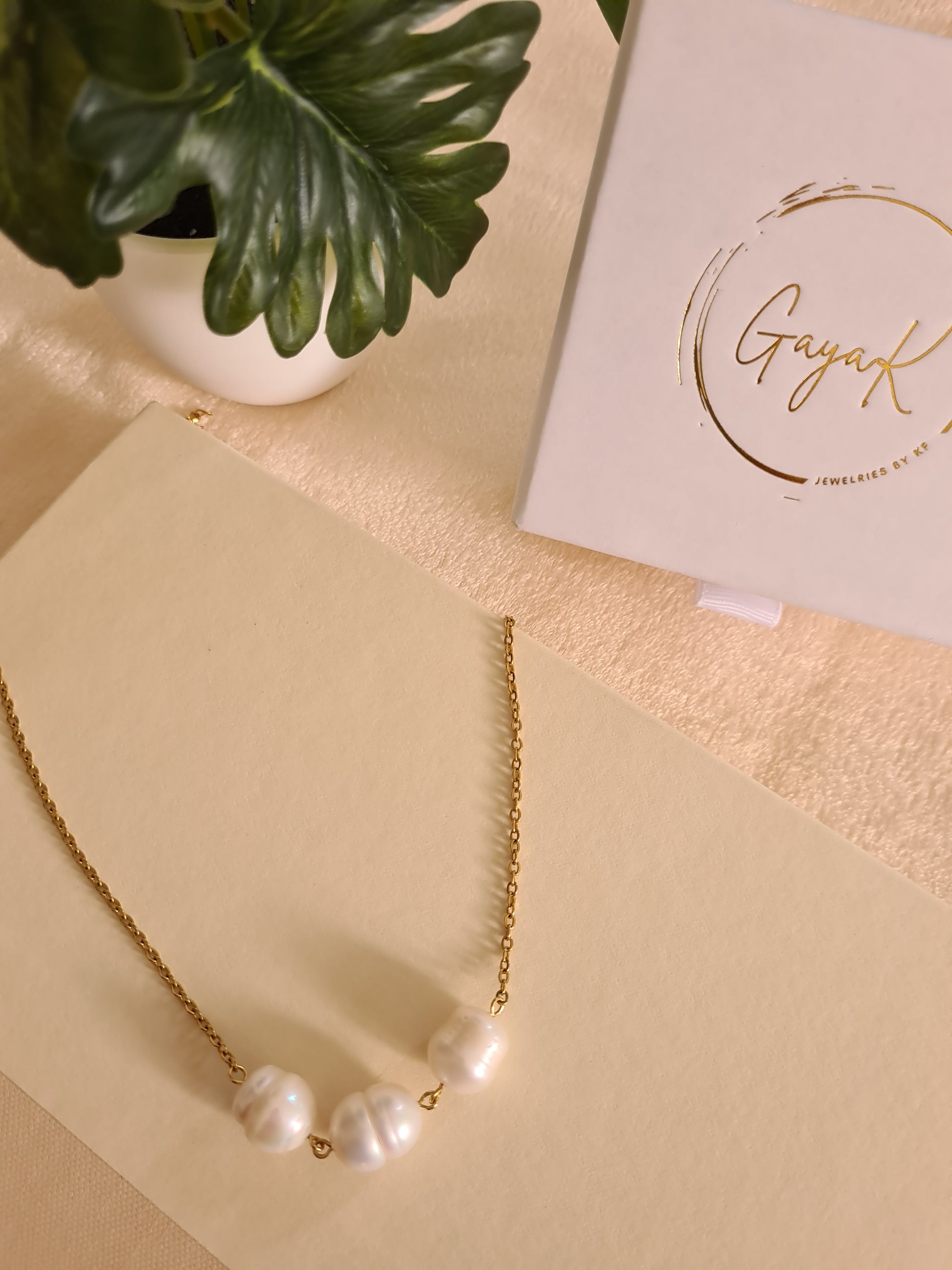 This necklace features a freshwater pearl on gold-plated and stainless steel hardware, with a total length of 47 centimeters and an additional 6 centimeters with the extender.